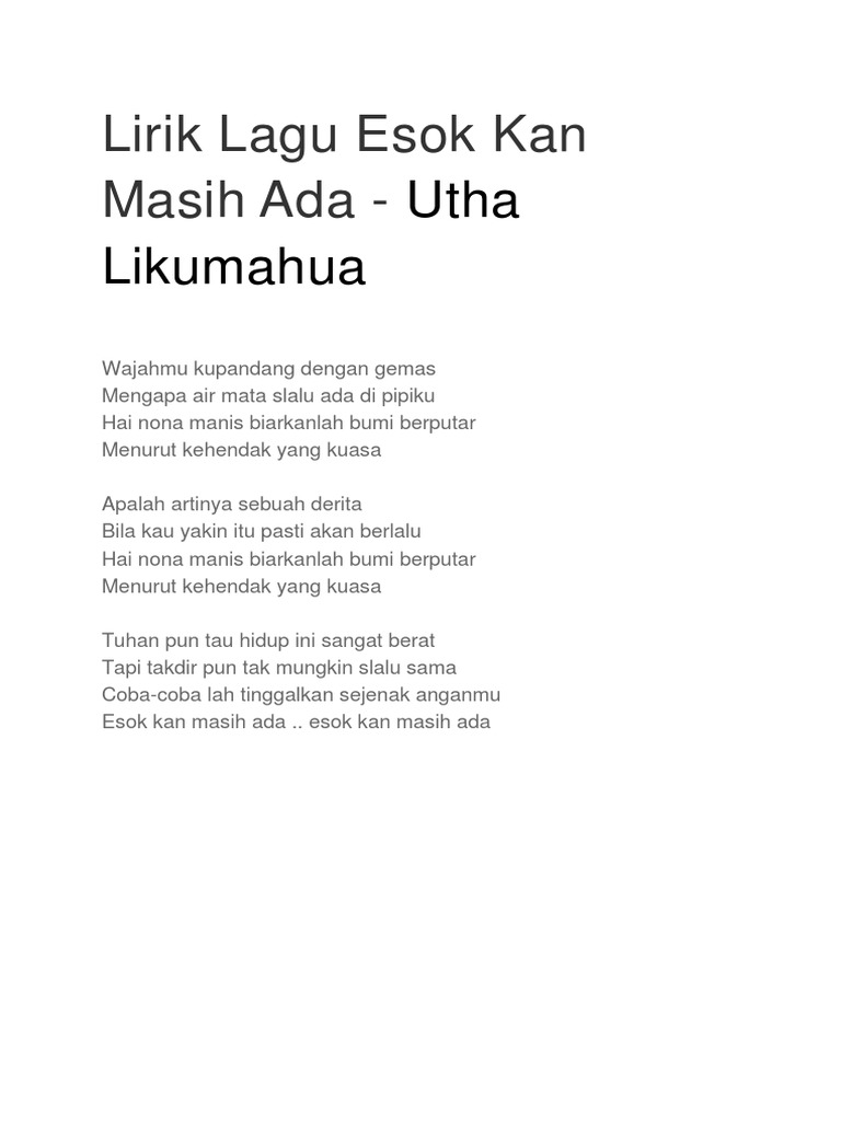 Lirik Lagu Esok Kan Masih Ada Oleh Utha Likumahuwa Penuh Rasa Syukur Ringtimes Banyuwangi